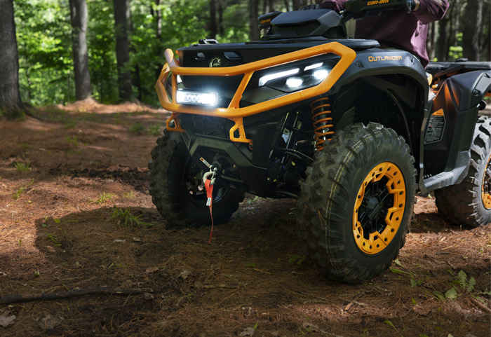 Equipado com amortecedores dianteiros e traseiro Fox 1.5 Podium QS3, direção dinâmica assistida de modo triplo (DPS), guincho com capacidade para 1.588 kg (3.500 lb), diferencial dianteiro autoblocante Visco-4Lok, para-choques dianteiros e traseiros reforçados, rodas de alumínio fundido de 14 polegadas com pneus Maxxis Bighorn 2.0 de 27 polegadas, defletores de vento no guidão, mostrador digital multifunção de 7,6 polegadas e muito mais.