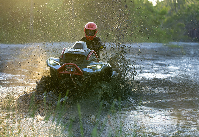 Um quadriciclo projetado especificamente para enfrentar grandes lamaçais. Potente motor ACE V-Twin de 999cc com 101 HP, transmissão CVT com marcha extra reduzida L, direção dinâmica assistida (DPS) de modo triplo, diferencial dianteiro Visco-4-Lok, amortecedores dianteiros e traseiros à gás, sistema de snorkel, refrigeração líquida e radiador reposicionado, rodas e pneus que permitem enfrentar os terrenos mais enlameados e desafiadores.